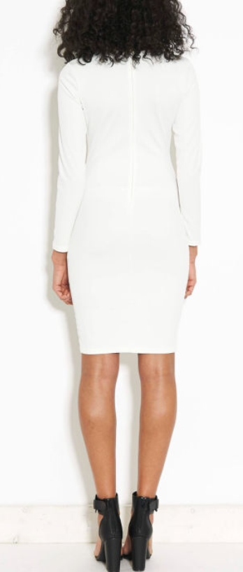 TFNC bodycon white mesh dress. Midi length with long sleeves, high neckline and mesh paneling. Perfect party/event dress with any black or color popping shoe and a cute clutch.